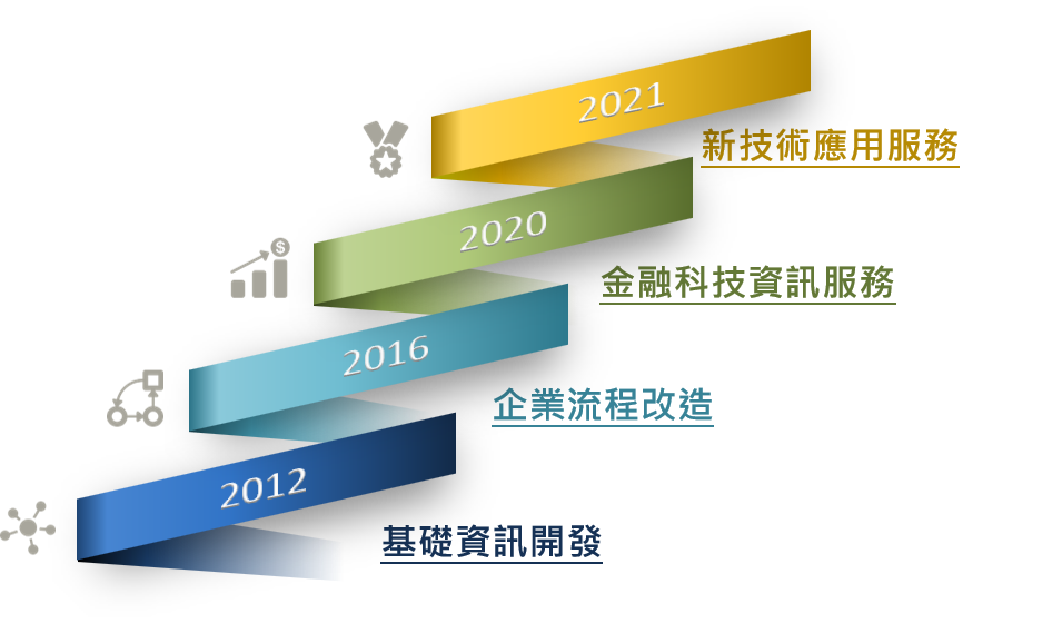 公司成立初期的主要業務為製造業的ERP/MES/CRM等系統建置與系統整合;隨著市場需求及科技發展,迅速加入Web開發、APP 行動裝置開發、客製化系統建置等服務項目;近年來,更進入金融保險產業、人力派遣領域的客製化專案開發。